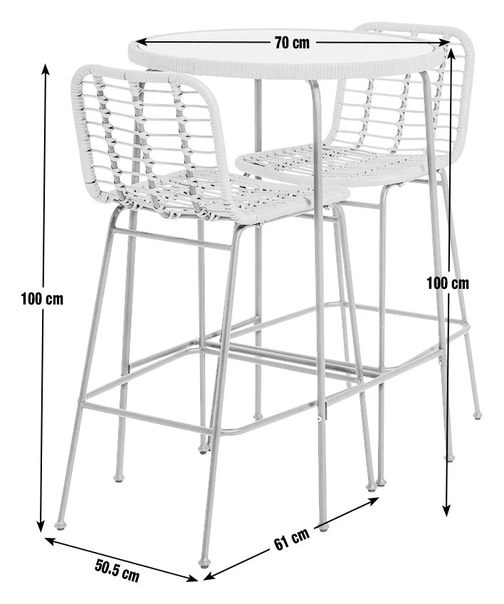 Create a bistro zone on your own patio with our chic bar set. This 3-piece combination is striking and just perfect as we enter the warmer months. Classically styled with a rattan-edged, round glass table top and typical thigh-high bar chairs it's great for brunch, lunch or evening cocktails. Comfortable, stylish and fun.