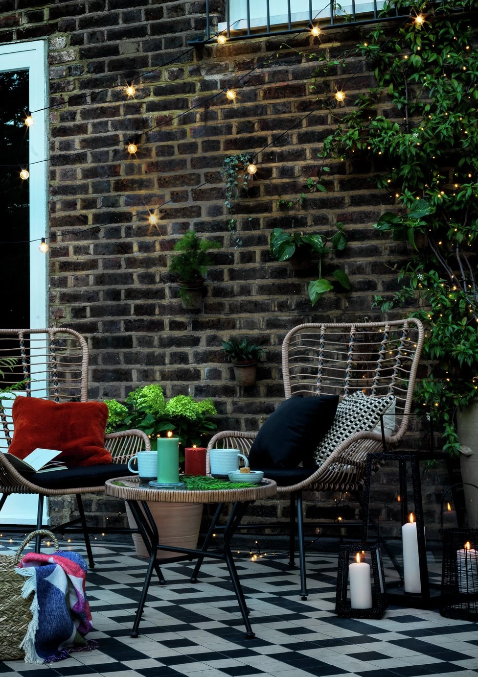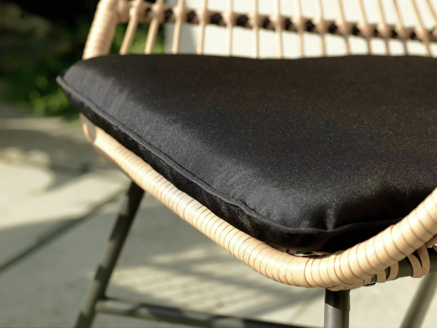 Charming, chic and oh so curvy. Claim your favourite corner of the patio or balcony for this Boho inspired bistro set. You'll be curled up for hours. The natural rattan effect armchairs offer ergonomic comfort, and contrast beautifully with the striking metal black legs. Designer black cushions finish the look. Stunning meets practical. The glass topped coffee table makes it easy to wipe and all covers are machine washable so they clean up nicely too. Morning coffee, afternoon tea, prosecco evenings? Any excuse!