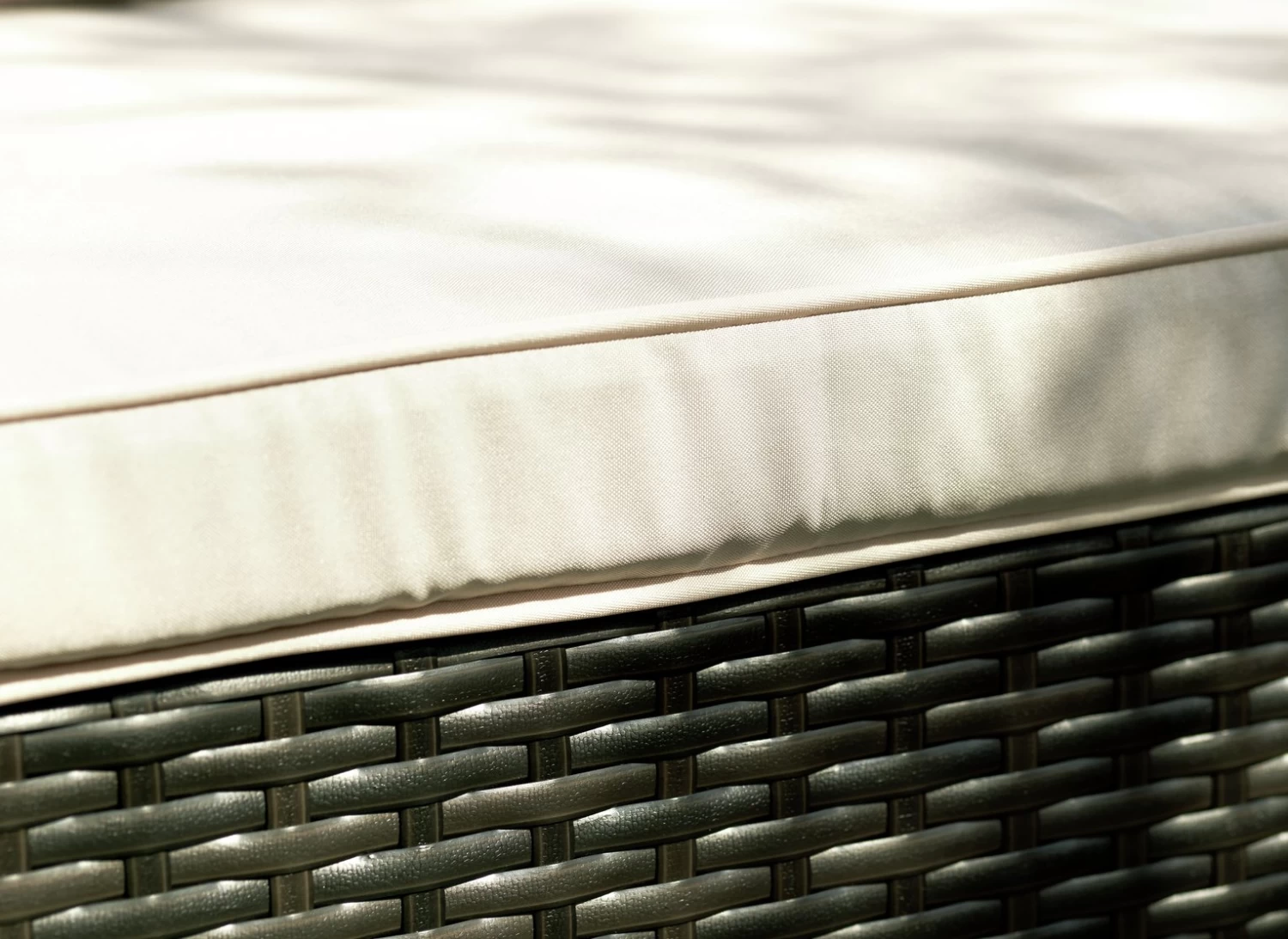 Create a comfy corner. This stylish sofa and stool combo can be arranged just the way you like. Then rearranged! Feet up with a good book or chatting with friends? The traditional, lightweight rattan patio set offers maximum flexibility. Six classic cream cushions confirm the comfort factor. Just wipe them clean with a damp cloth so keep their 'just like new' appeal.
