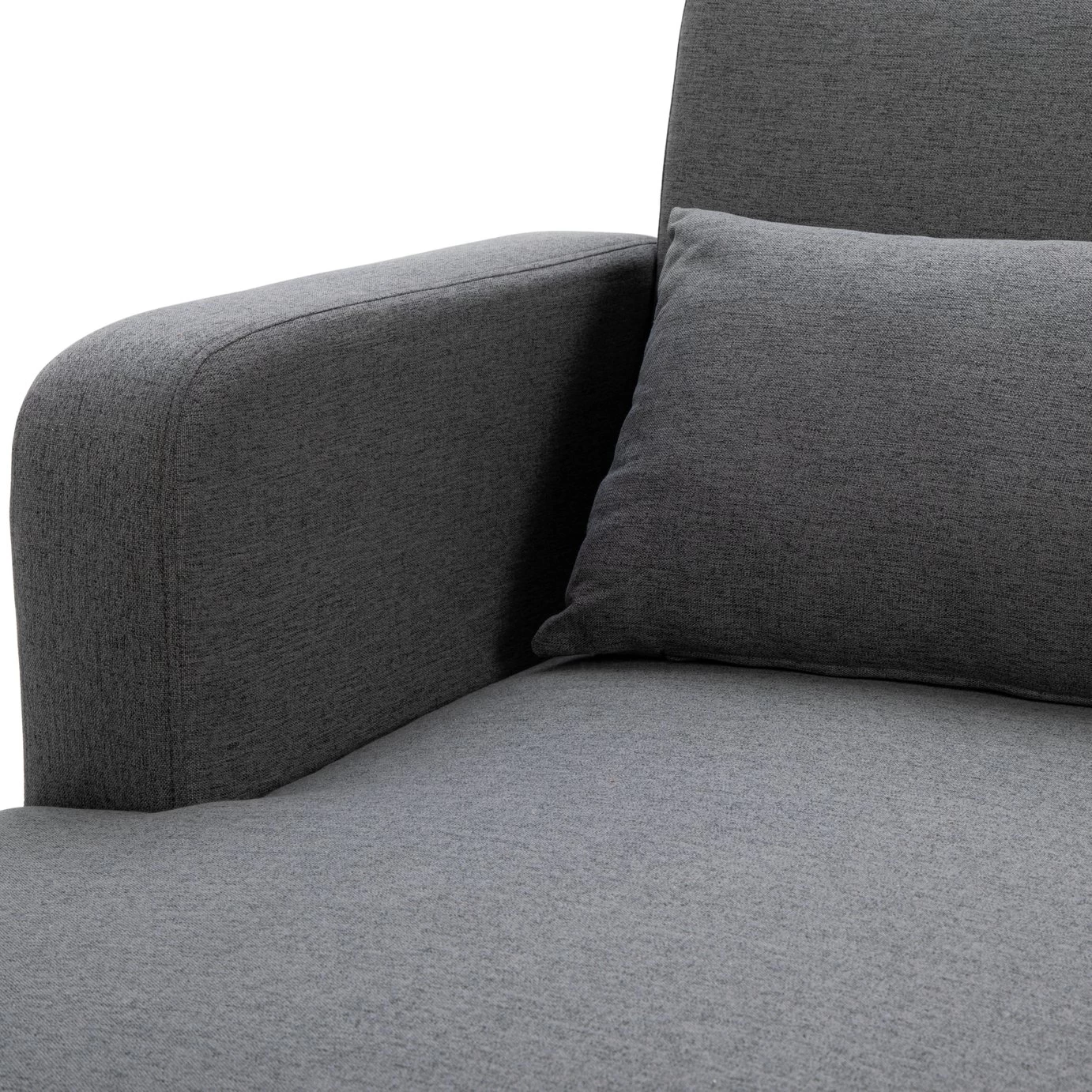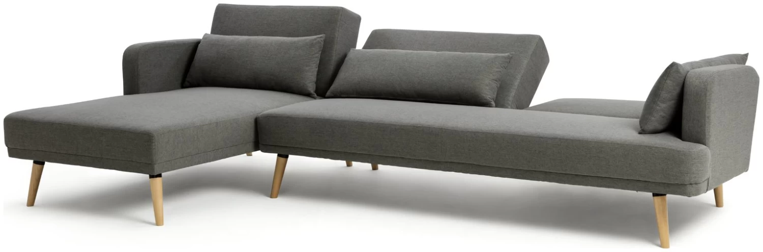 Chaise lounge, chaise sleep. Here's a practical solution to a spare bed problem that's doesn't compromise on style. Upholstered in grey fabric, our left corner sofa bed displays its clean modern lines and generous seating. Need a spare bed? With a simple, click, clack movement our 3 seater chaise sofa bed can sleep up to 3 people. Very handy, Andy.
