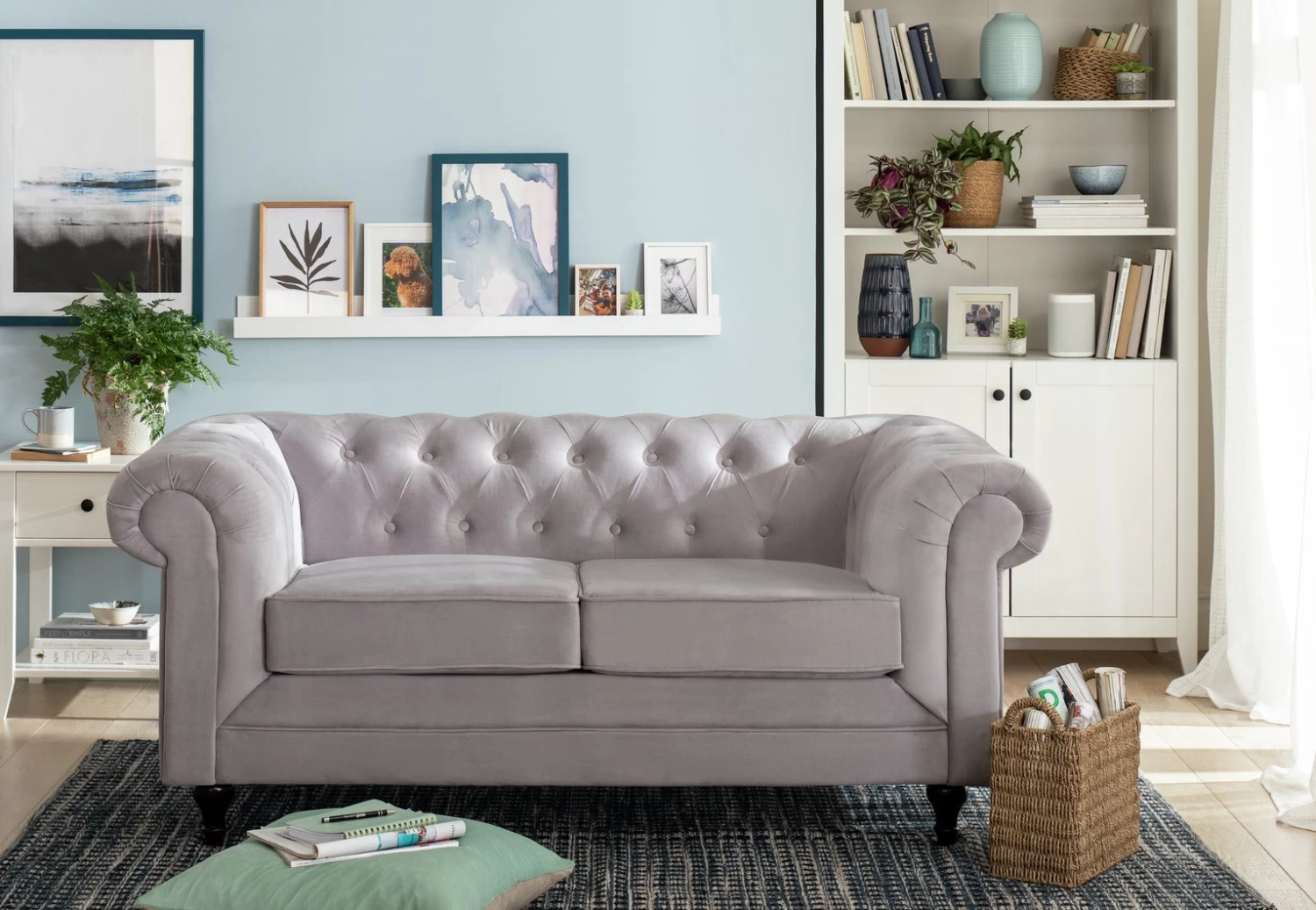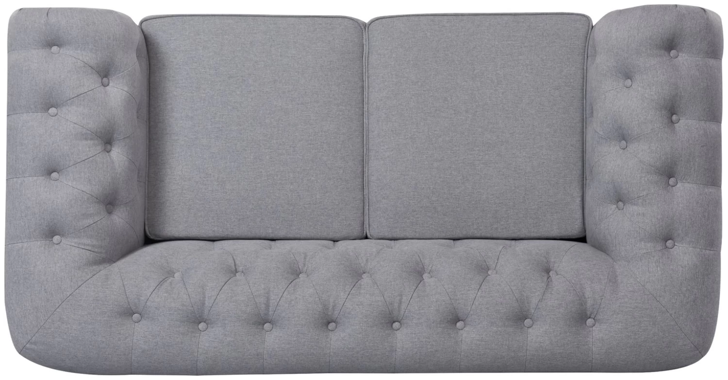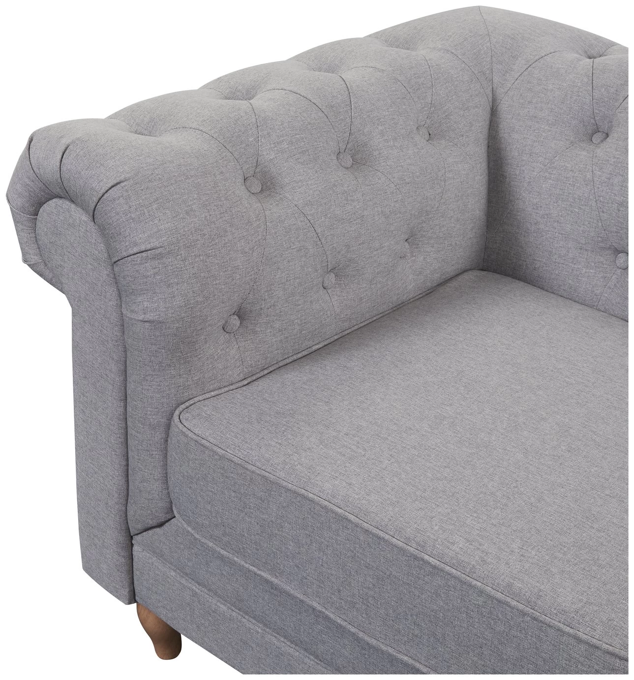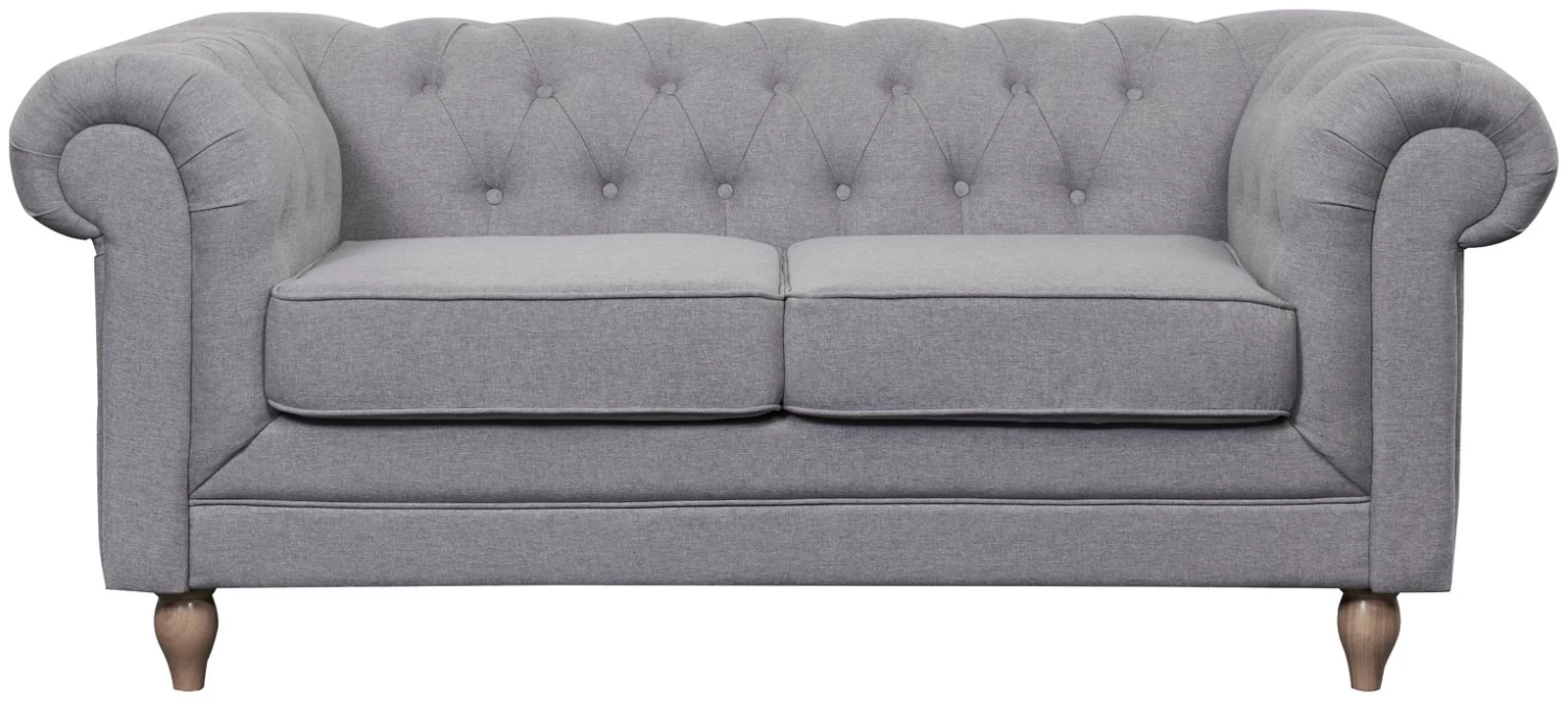 Searching for a classic statement sofa? You can't go wrong with our rich grey polyester 2-seater Chesterfield. It has all the iconic features you'd expect with this traditional design. A low padded back with deep button tufting, elegant scroll arms and turned wooden legs. Plump pocket sprung cushions and piped detailing add to its upmarket credentials. This is one timeless, tasteful seat. Need we say more?