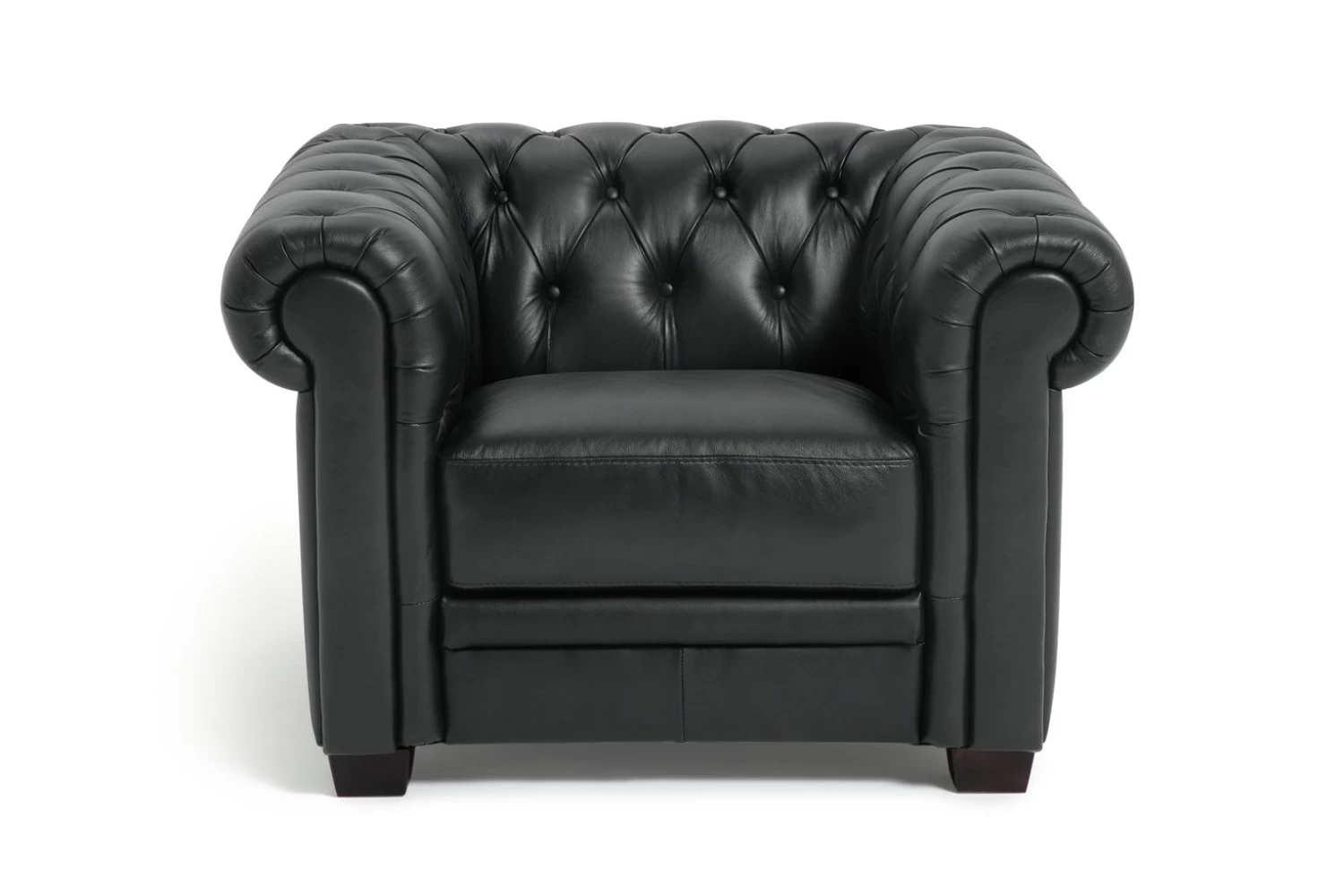 An iconic piece. Classic and timeless, the Habitat Chesterfield armchair boasts a scroll arm design with sumptuous deep buttoning on the back panel and arms. It's beautifully upholstered in top grain semi-aniline leather for a truly luxurious feel. It stands on real wood feet for the perfect finishing touch.