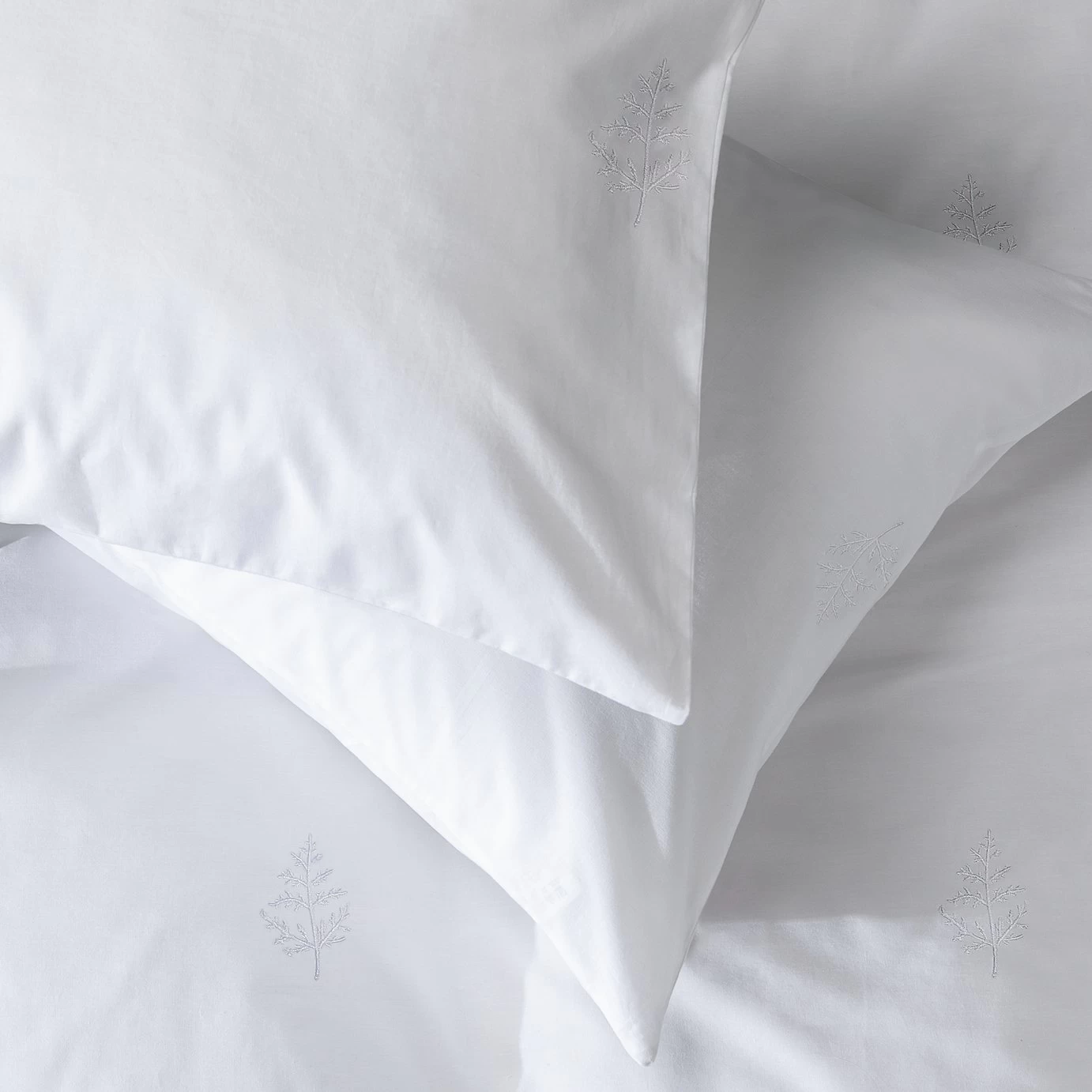 Silver embroidered leaves on white cotton, we've elegant country charm all sewn up. This bright white duvet set features a subtle textured botanical repeat pattern. Made from quality cotton percale, the fabric is soft and designed to last. Fresh looks and cool comfort. A combo worth getting into bed with.