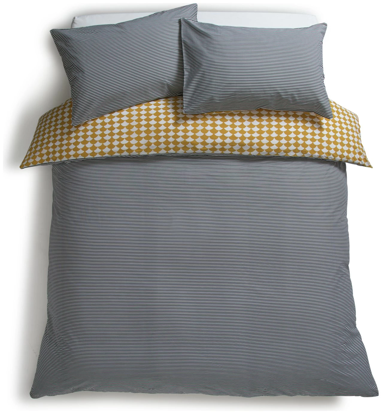 Designer's delight. Our Scallop bedlinens feature a mustard scallop graphic on one side and a grey pinstripe on the other. 100% cotton and a 180-thread count make them cosy to sink down into at the end of the day. A true design classic, Scallop fits with any decor style from Scandi to modern to country house. And this great value double set comes with 2 pillowcases and a duvet cover.