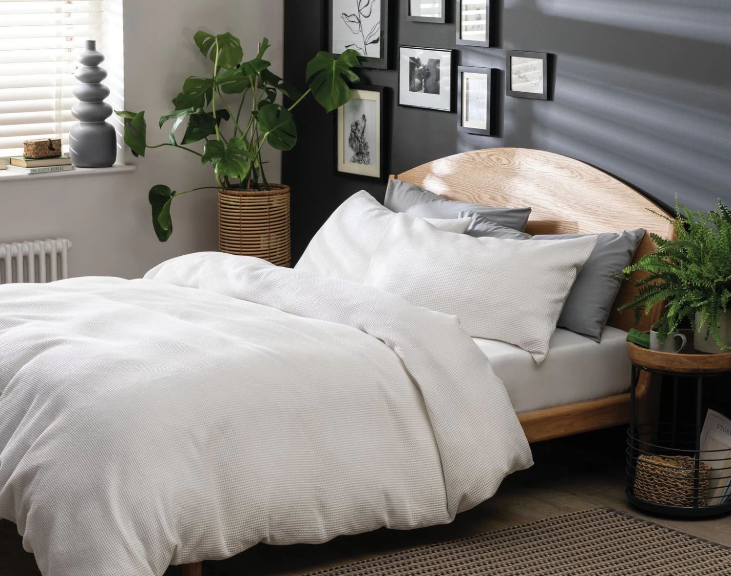 Add a contemporary twist to your bedroom and match this fresh white duvet set with light wood and natural curves and textures.