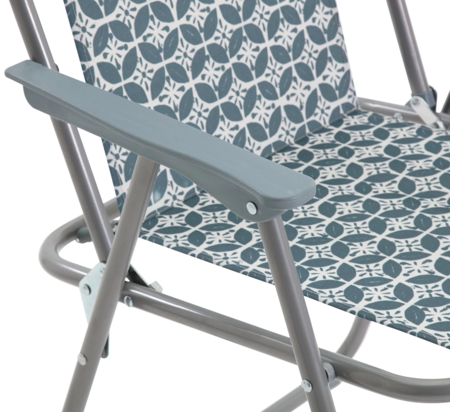Kick back and enjoy the sun. In a bold blue geo print, this metal and fabric picnic chair is made for chilling. Easy to carry, it folds flat so you can read, rest and repeat wherever you go. And when the sun hides behind the clouds, simply tuck your chair neatly away. A comfy companion for the beach, BBQs and beyond.