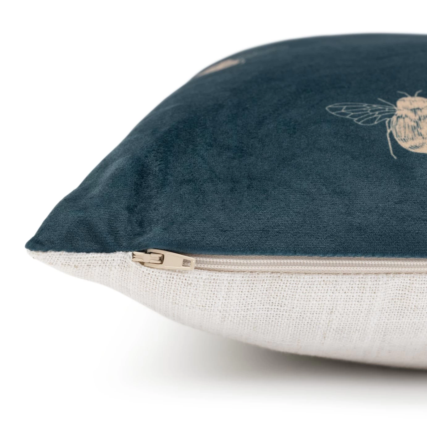 Linear gold bees against a dark blue green background gives this printed velvet cushion a deep richness. To ring the changes, simply flip over to its plain linen side. Made in the UK with a zip off washable cover.