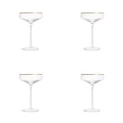Sip in style. Our dainty pack of 4 stemmed glasses are beautifully elegant with a metallic gold rim detail. These golden champagne coupe glasses will bring a touch of luxury to your festivities. Dinner party, birthday or Christmas drinks? Pop a cork and celebrate with family and friends. Bring out the bubbles and create colourful cocktails too. Fabulous fizzy fun.
