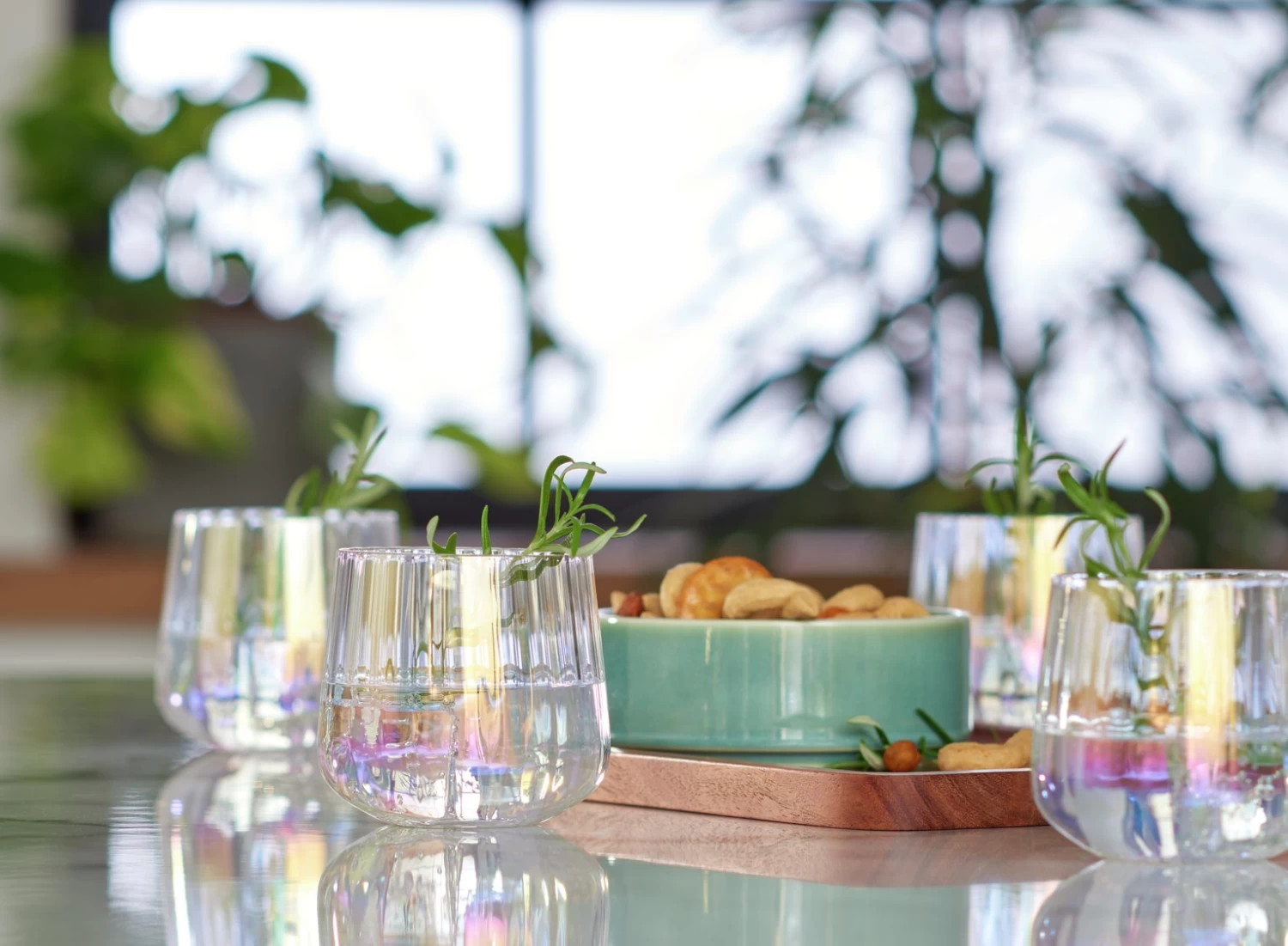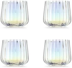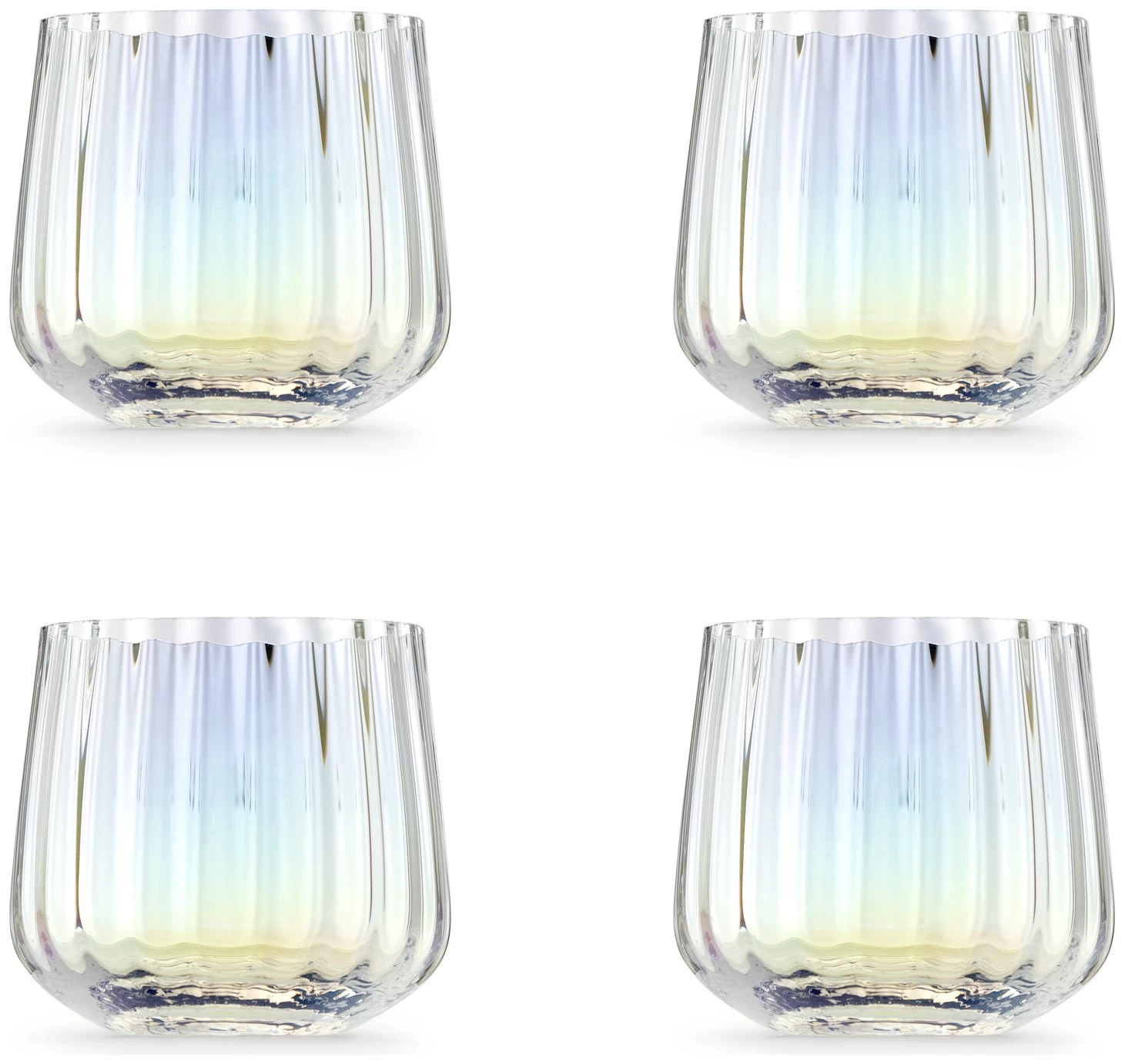 Irresistibly, iridescent. Gentle pastel hues shimmering on a fluted design ensures these 4 glass tumblers stand out from the crowd. Whether it's a Monday mocktail or a weekend G&T, this pretty foursome have a real party feel. They even make plain water look special. Cheers to that.