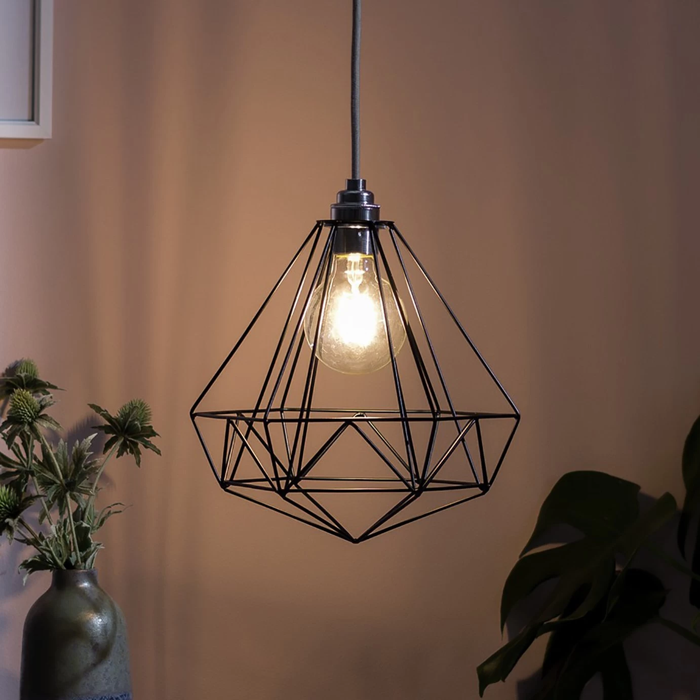 Geometric design makes a bold entrance with this strking pendant shade. With its black steel finish it celebrates the brilliance of feature bulbs, exposing the bulb for a clean understated look. Designed to cast bright light across your room, the Kanso wire pendant shade is a must for any modern on-trend space. See the rest of the Kanso collection to complete the look.