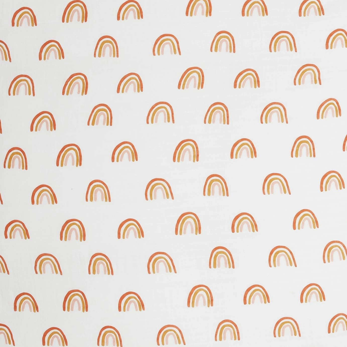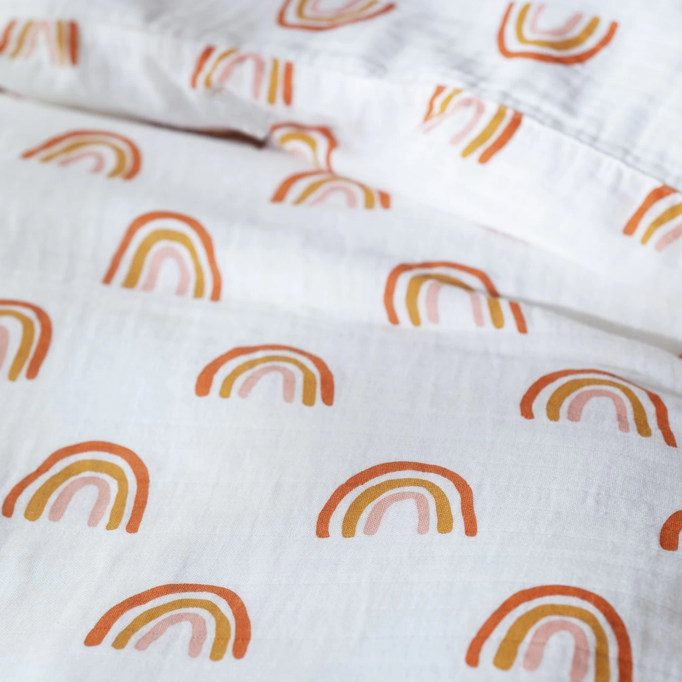 Our funky, modern toddler bed set will brighten up rainy days, sunny days and every day. With a simple, orange rainbow design on a crisp, white background, it's a breath of fresh air to a child's bedroom or your guest bedroom.