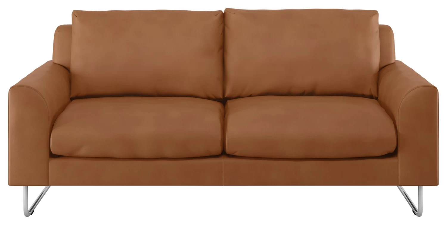 With squashy cushions and curved arms that soften its angular lines, the Lyle tan premium leather 2 seater sofa is a relaxed, contemporary design. Perched on chromed ski legs, the inviting sofa's narrow frame allows a generous seat for its size; its cushions have a neat tucked detail on their corners and are removable for regular plumping. The sofa is hand made to order and is part of the Lyle range, available in various sizes with fabric or leather upholstery in a choice of colours.
