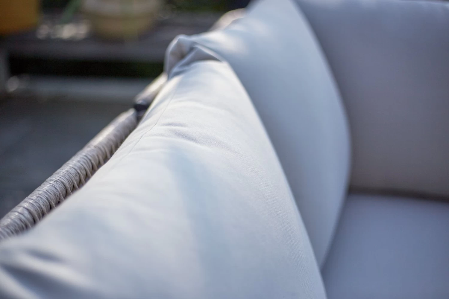 - Polyester fabric and beige cushions.