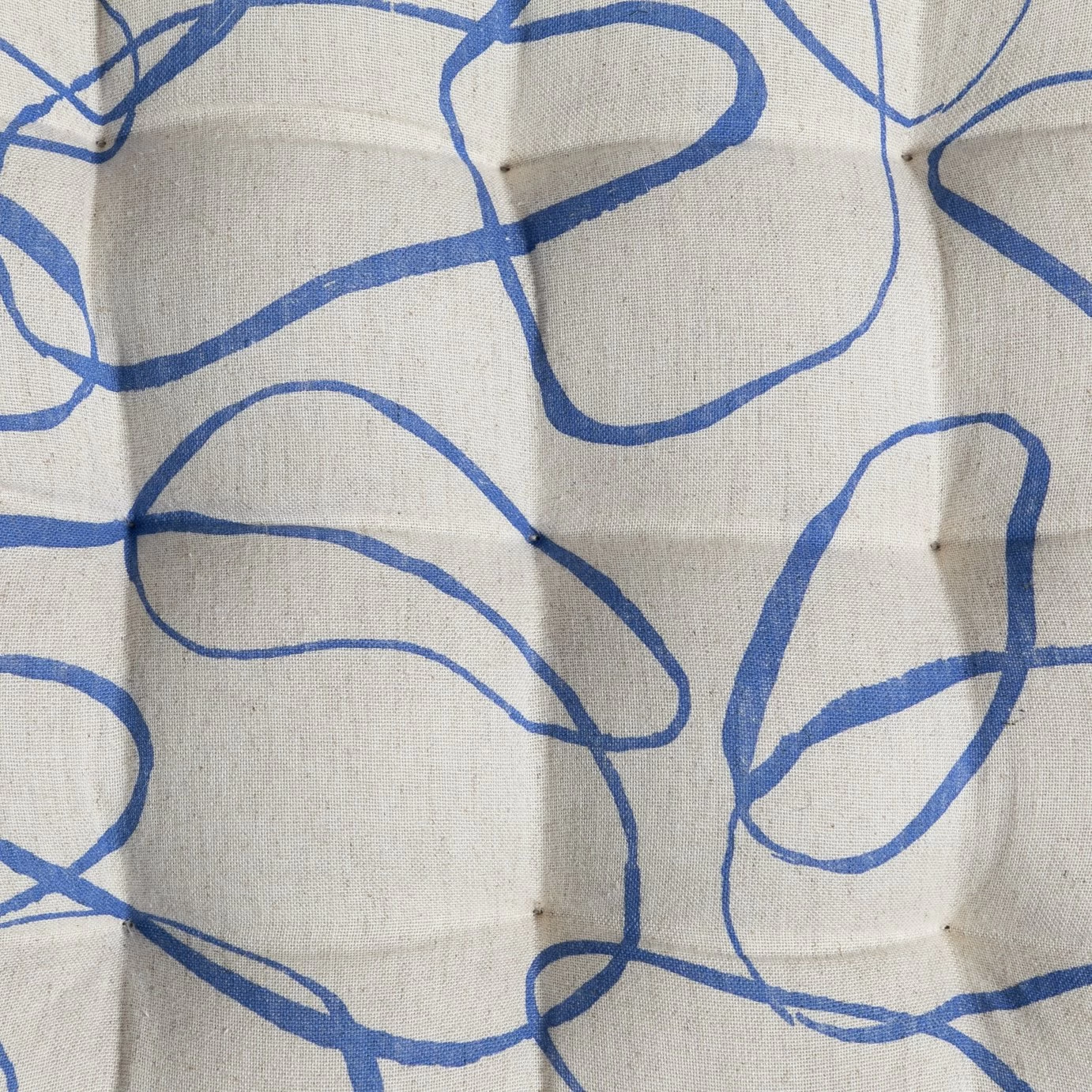 Ripples of soothing blue. Give hard chairs an instant comfy makeover with our pair of plump, tufted tie-on linen seat cushions. Deep blue swirls on a cool white sand background delivers a Mediterranean mood. Very in-vogue. We've a soft spot for these smart seats.
