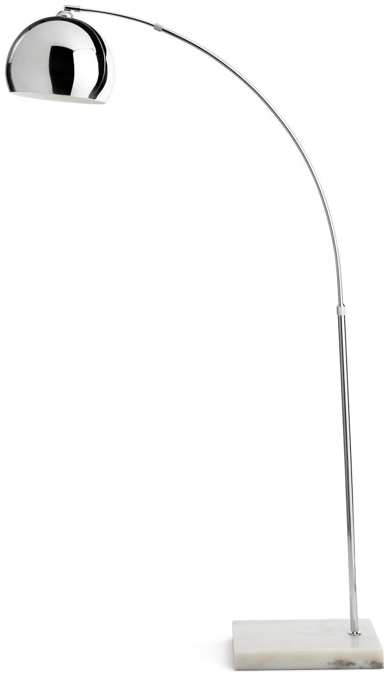 Cool and curvaceous in chrome. Our stunning Arc floor lamp lifts the decor of your living room to show home glamour. The reflective silver shade hangs elegantly on an arched stem held in place by a sturdy marble base. Position it to throw light over the sofa or armchair, or have it illuminated a dark corner of the room. Makes a striking feature whatever you choose. Just tap the foot switch and settle down with a good book. Tres chic!