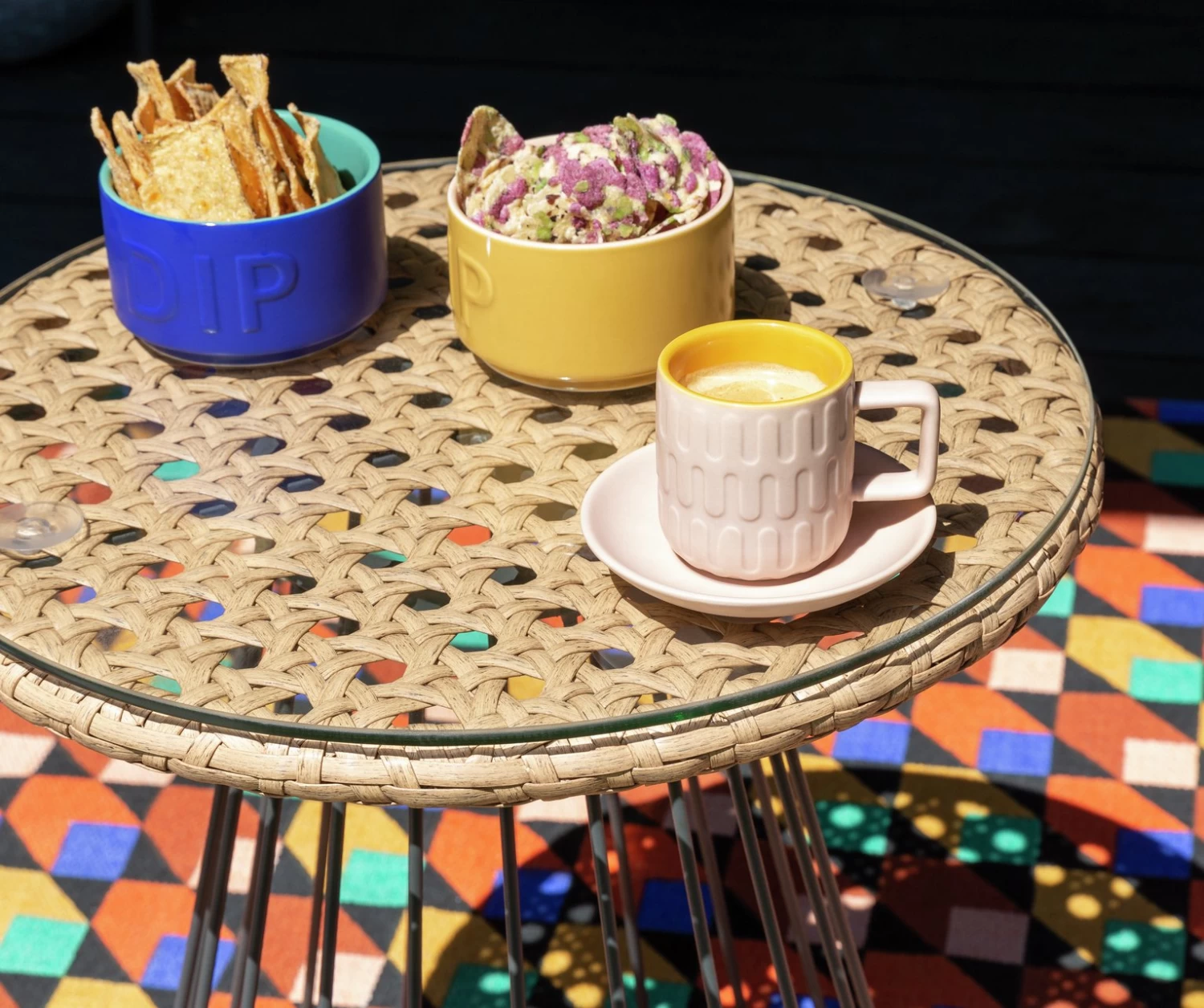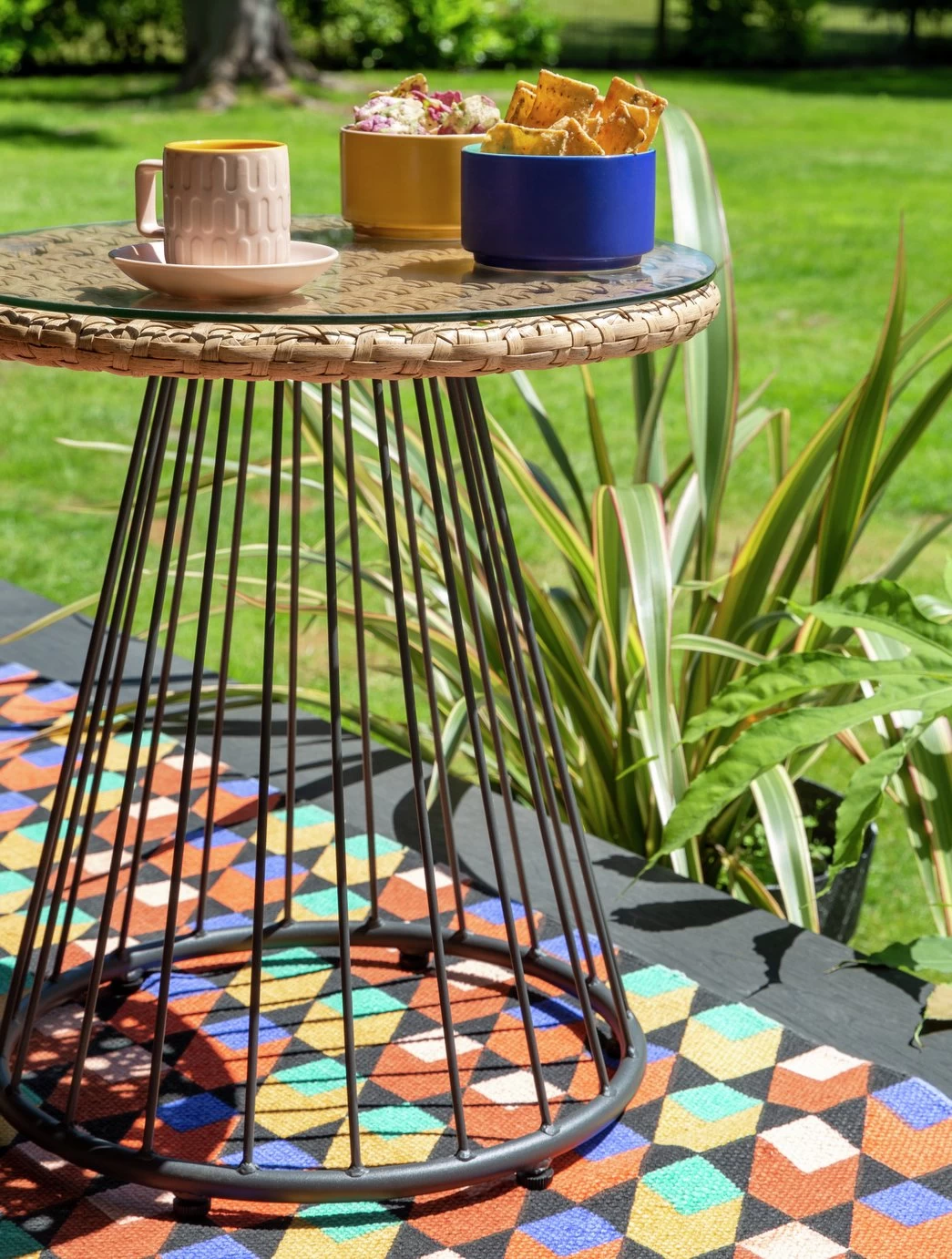 Add some low-level solar lighting or floor lanterns and a rug, for that indoors outdoors look.