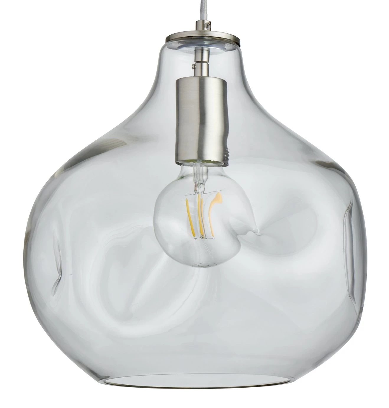 An elegantly simple design with a contemporary twist. The Ori dimple glass pendant light is a clean, modern addition to any dining room, kitchen, or hallway. Finished in nickel with a clear, mouth blown glass shade, it features a dimpled silhouette that adds a unique quality to the design. Suspended on a soft, fabric covered cord, it's ideal for adding ambience to a room without dominating the space. Looks fantastic in any style of home setting.