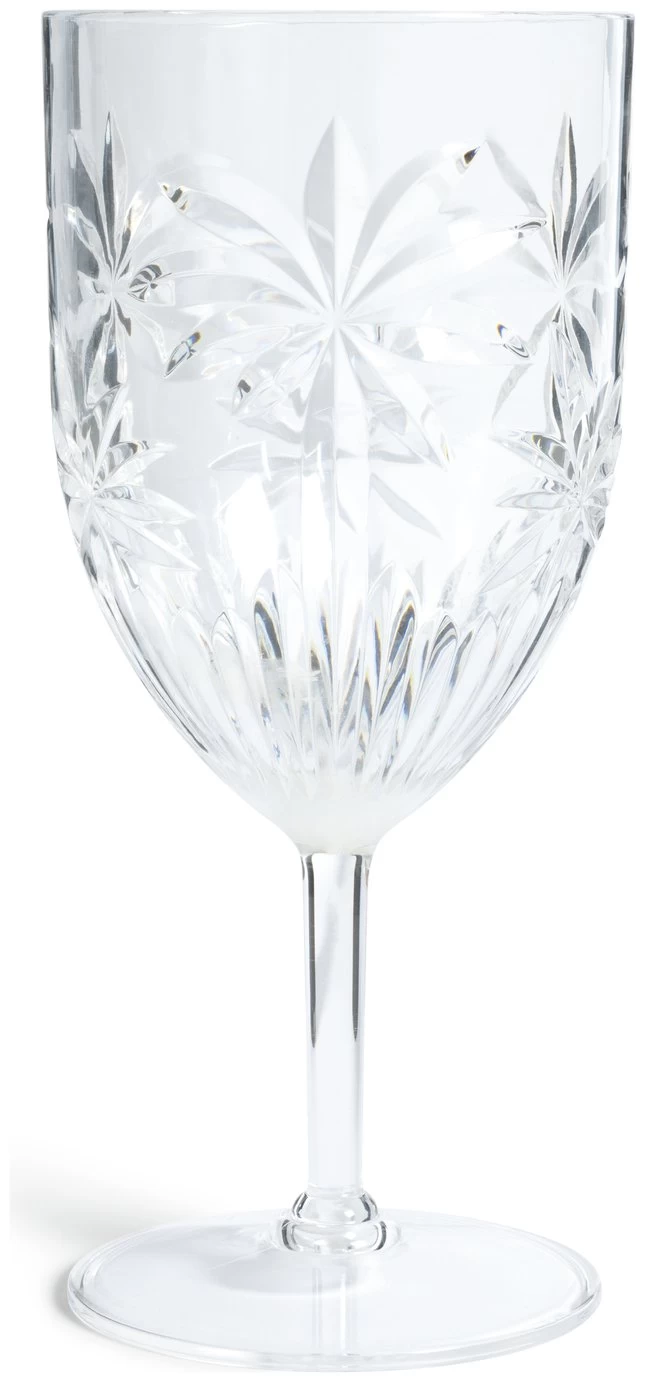 Enjoy the outdoors while sipping wine from one of these pretty palm etched lovelies. And no oops moments to spoil the occasion. This set of 4 acrylic wine glasses don't mind a fall. Let's drink to that.