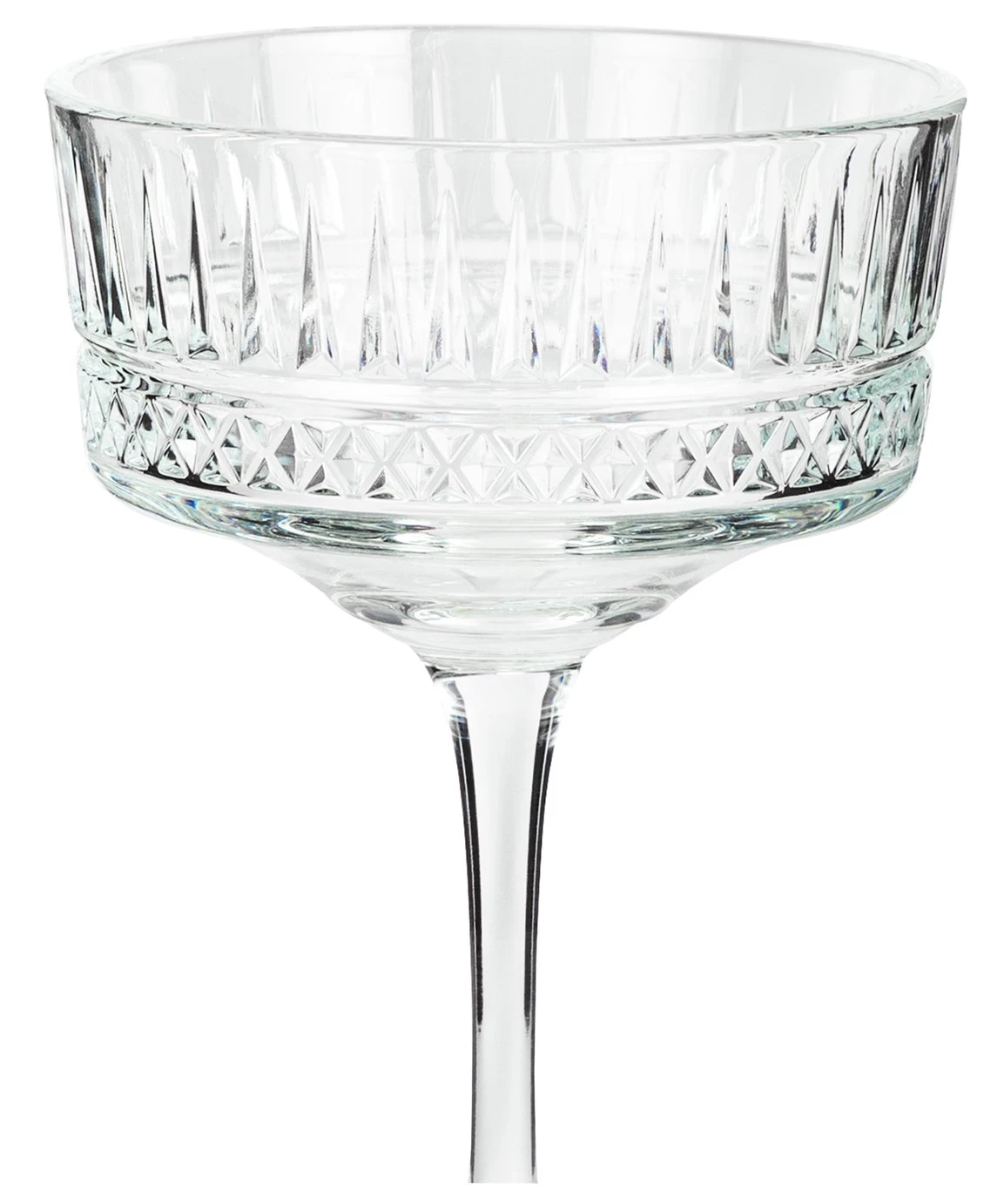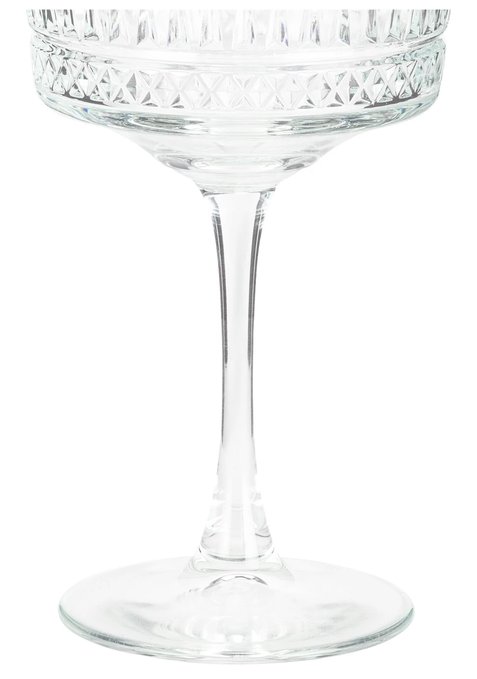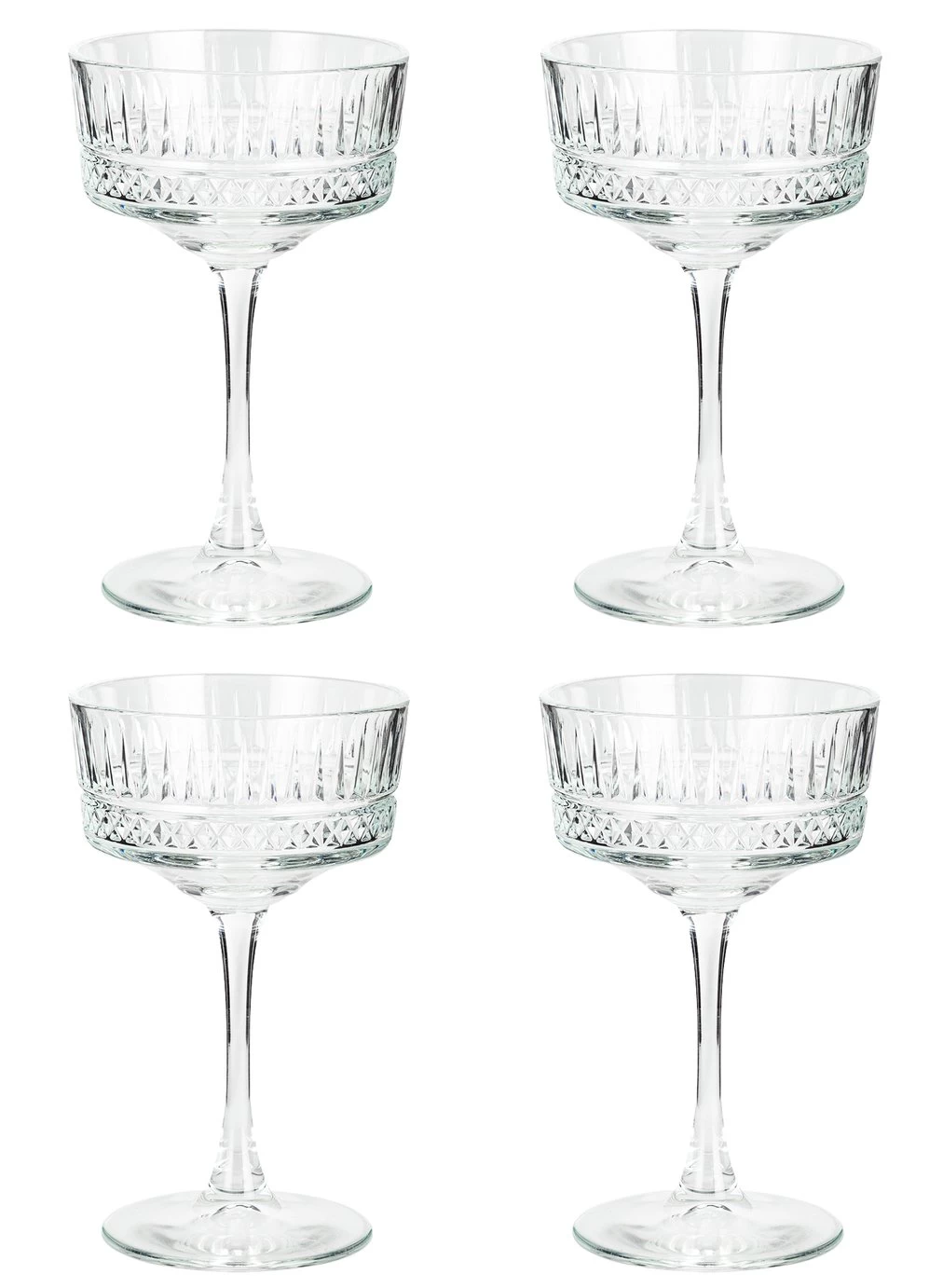 Raise your glass to these glamorous champagne coupes. The broad bowl, long slim stem and strong base is pure Art deco decadence. And so on-trend. With a beautiful cut glass design they're the height of retro chic. Fabulous for fizz and classy with a cocktail, this set of 4 vintage inspired glasses set the scene for a classic night. They're kind to your hands too, just pop into the dishwasher to keep 'em sparkling. Loving the vintage vibe? Take a look at the rest of our gorgeous glassware. Chin chin!