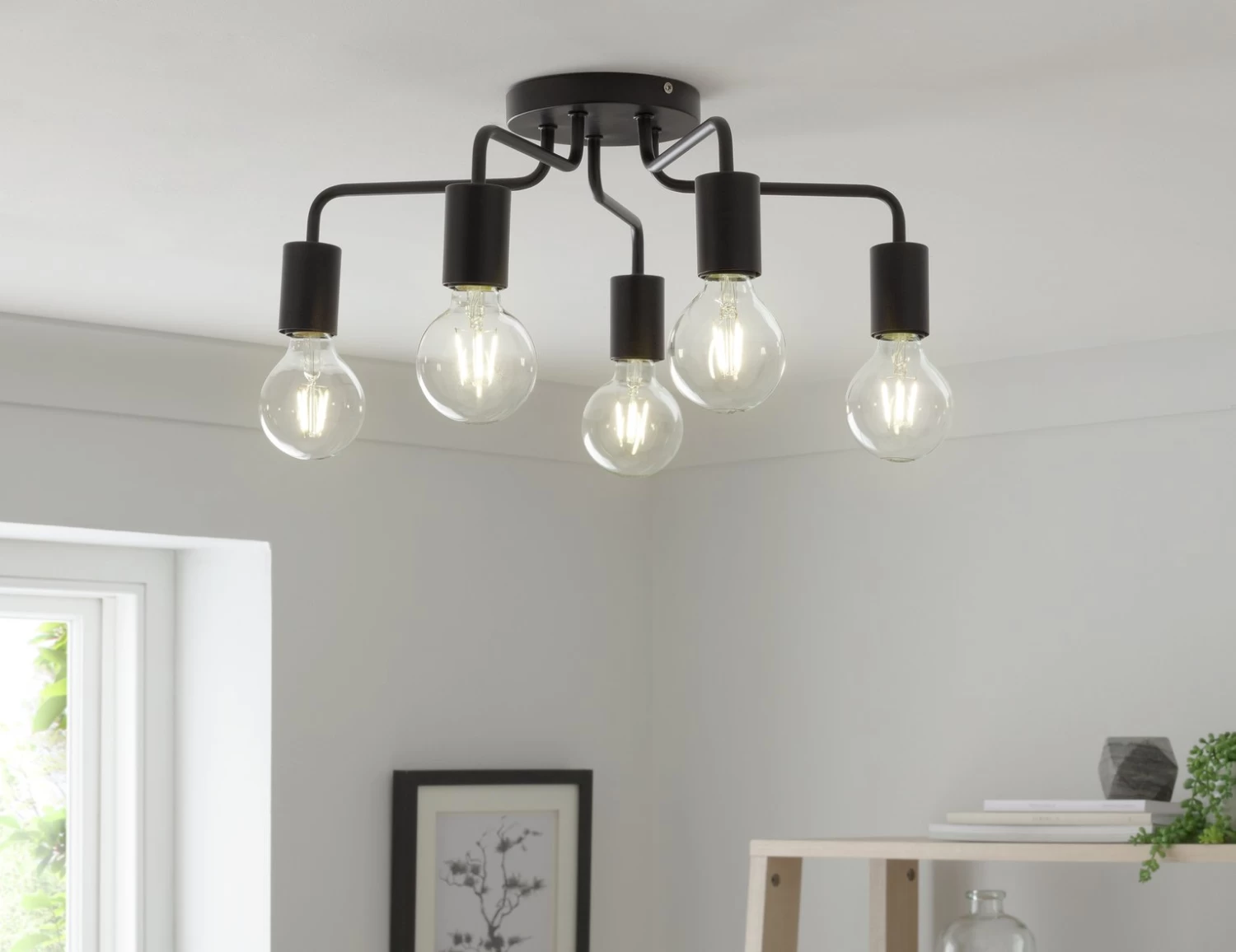 Sleek matte black meets minimalist design for a modern vibe. Clean and crisp, this black Rayner 5 light ceiling light will give your home an instant style uplift. Designed to shine light across the entire room, this is the perfect ceiling light for rooms that want a bright and open feel. Bulbs included.
