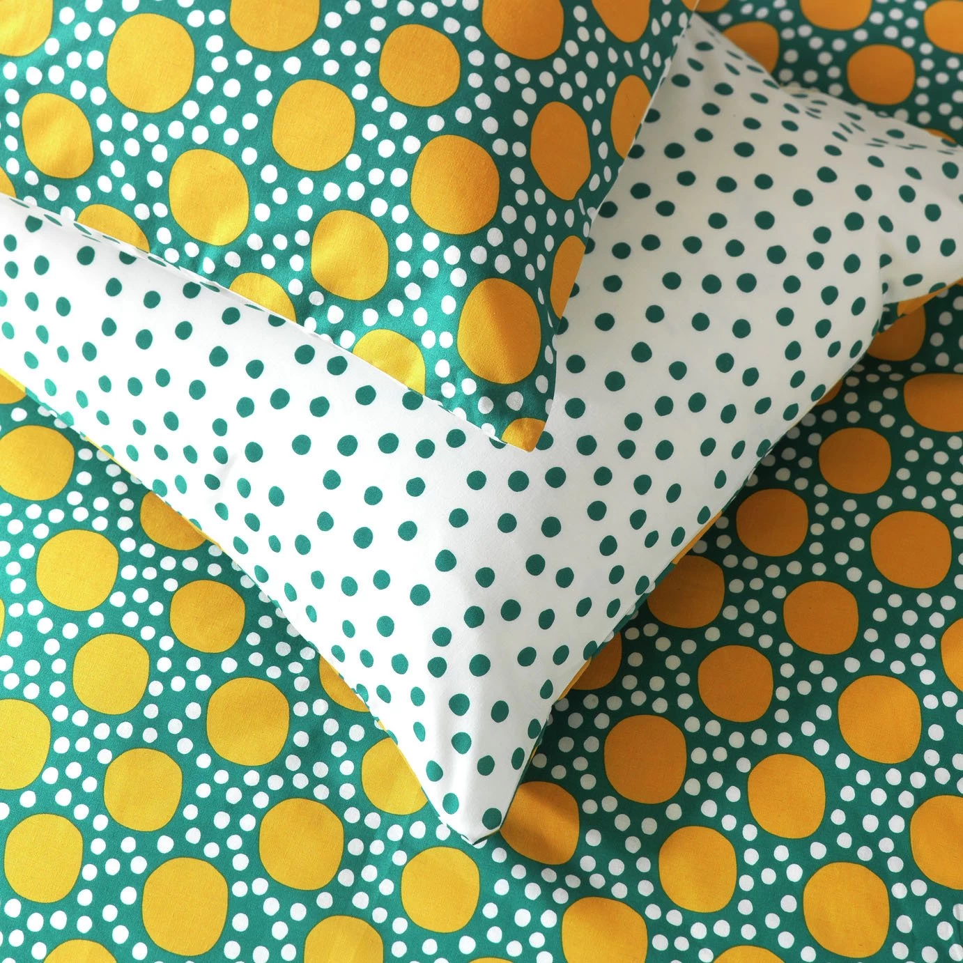 Good morning sunshine. Our Global Sunburst Geo bedding set features bold yellow graphics on one side and a spotted pattern on the other. Quite the showstopper. And made from a soft and airy polycotton blend, it's great for sinking into. Your daily dose of happy.
