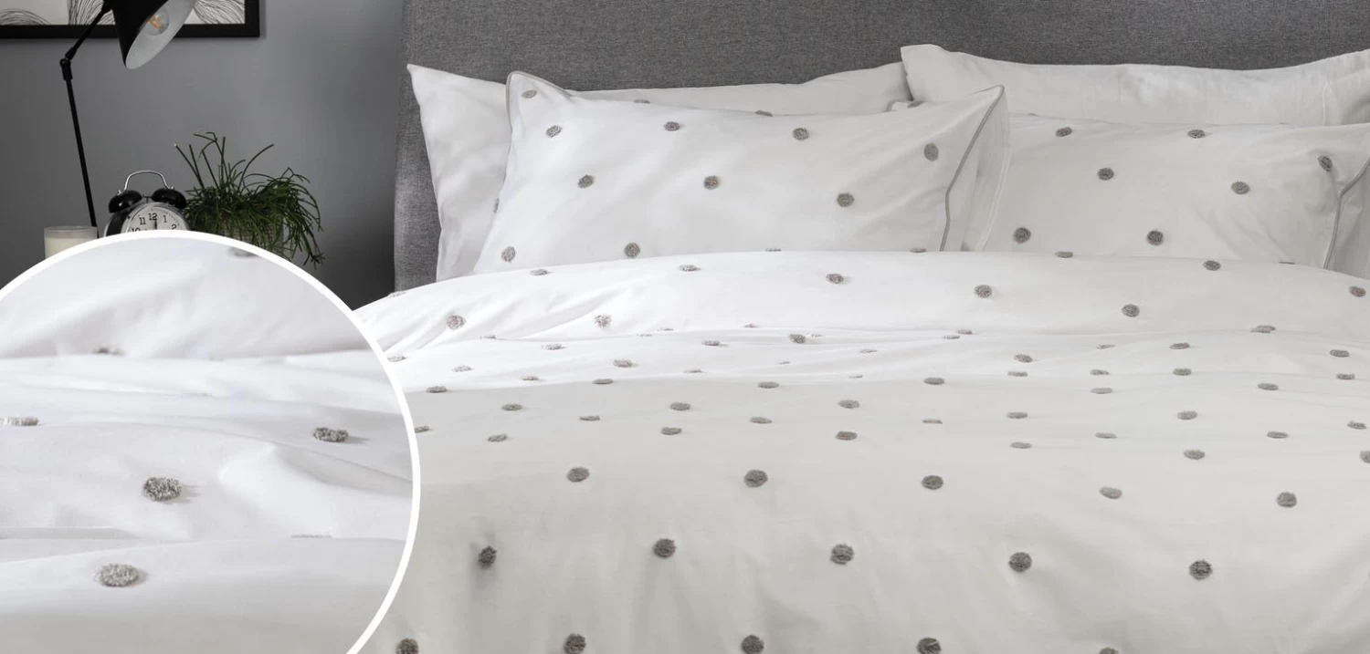 Deliciously dotty. Our tufted duvet set is pure simplicity. In fresh white and grey textured tufts, we love the way it lightens and brightens a bedroom. Delicate piping adds a final designer touch. Snuggle down and enjoy the temperature control that this type of cotton percale is known for. With a 180-thread count, it's soft, comfortable and all you need to sleep like a baby. Sweet dreams.