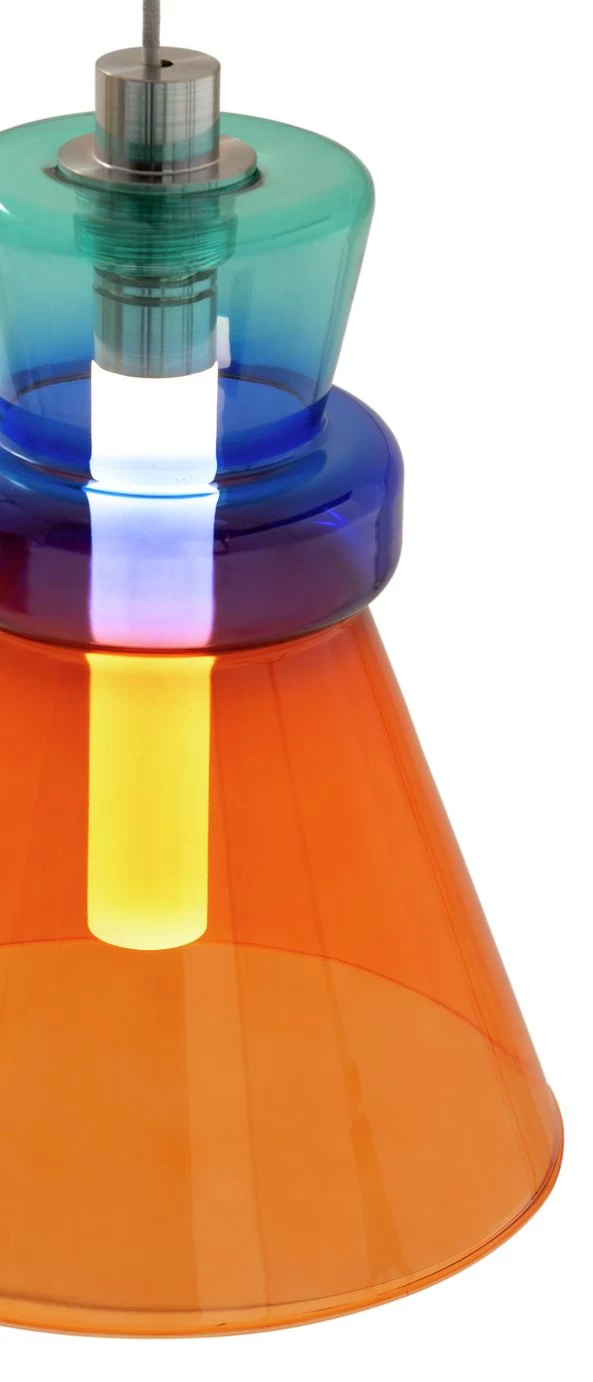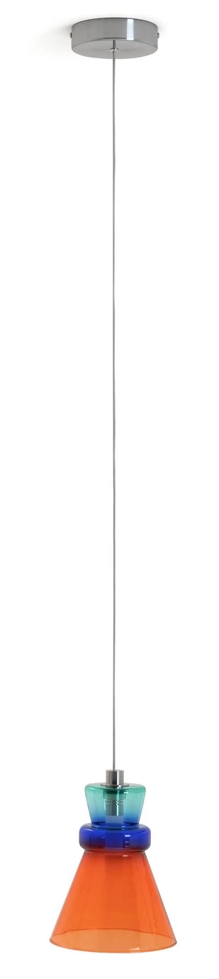 Rainbow rhythm. With bursts of blue, turquoise and orange, the Vivian pendant light is as groovy as they come. Made from glass and finished in brushed chrome, it shows off without stealing focus. Hang it in your living room, bedroom or hallway for some colour-block cool. Vivian puts the fun in funky.